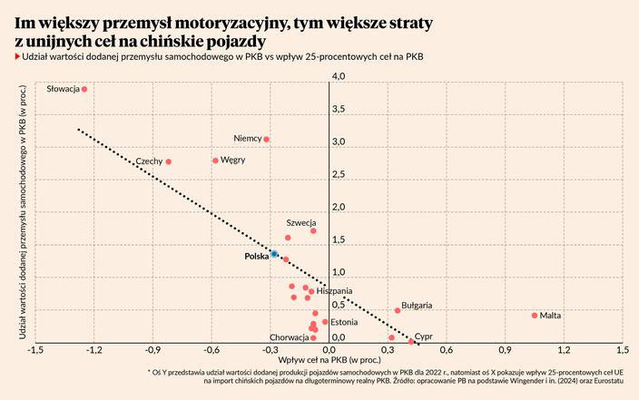 Badanie ekonomistów MFW zatytułowane „Europe's Shift to Electric Vehicles Amid Intensifying Global Competition” pokazuje, że nałożenie 25-procentowych ceł na cały chiński import towarów motoryzacyjnych może skutkować obniżeniem długookresowego realnego PKB w krajach o dużym znaczeniu przemysłu samochodowego. Przykładowo — dla Słowacji straty w PKB sięgną 1,3 proc., dla Czech 0,8, dla Węgier 0,6, a dla Niemiec 0,3 proc. Polska należy do krajów, które również mają stracić na wyższych cłach — PKB będzie niższy o 0,3 proc. Co prawda napływ bezpośrednich inwestycji zagranicznych z Chin nieco kompensuje koszty (zwłaszcza na Węgrzech, gdzie chińskie marki rozbudowują swoje fabryki), jednak efekt netto pozostaje ujemny. Generalnie cały region Europy Środkowo-Wschodniej przez swoją otwartość na gospodarkę światową jest mocno wrażliwy na eskalację napięć handlowych, np. S&P obniżył wczoraj prognozę wzrostu PKB dla Polski o 0,1 pkt proc. — do 3,1 proc., uzasadniając to m.in. narastającym protekcjonizmem.