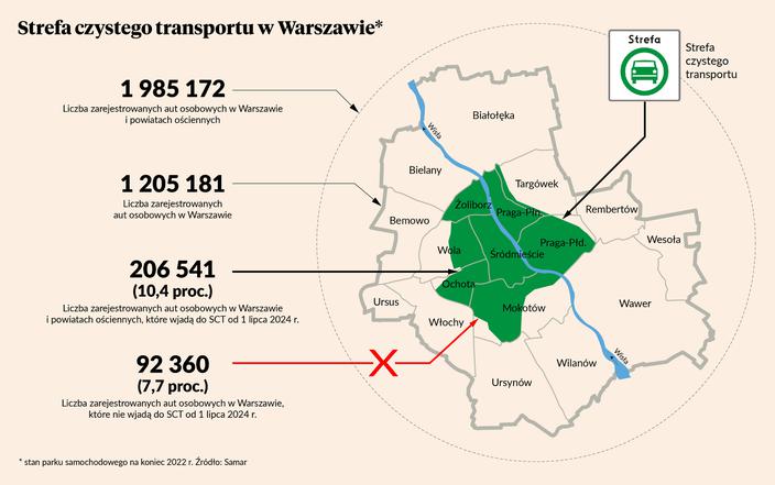 Co to oznacza w praktyce? Instytut Badań Rynku Motoryzacyjnego Samar obliczył, ile aut zarejestrowanych w Warszawie i w tzw. obwarzanku (powiaty wokół stolicy) zostanie w lipcu 2024 r. wykluczonych z ruchu w SCT. W Warszawie i powiatach ościennych zarejestrowanych jest (stan na koniec 2022 r.) ponad 1,98 mln osobowych aut z silnikami benzynowymi i diesla, z czego tylko w Warszawie nieco ponad 1,2 mln. W pierwszym etapie do SCT nie będzie mogło wjechać ponad 206,5 tys. aut, czyli 10,4 proc. parku Warszawy i tzw. obwarzanka. W przypadku stolicy chodzi o prawie 92,4 tys. aut, czyli 7,6 proc. stołecznego parku. Tyle teoria. W praktyce wykluczeń będzie znacznie mniej, bo przewiduje się wiele wyjątków. Na pierwszych dwóch etapach wprowadzania SCT mieszkańcy dzielnic nią objętych (pod warunkiem odprowadzania podatków w Warszawie) będą zwolnieni ze spełnienia tych wymagań — zaczną ich obowiązywać od stycznia 2028 r.). Ponadto ma być wprowadzony wyjątek dla seniorów oraz m.in. służb, pojazdów osób niepełnosprawnych, autobusów wycieczkowych, aut zabytkowych oraz specjalnych. W grę wchodzą również przypadki losowe, np. dojazd do szpitala czy lekarza. Z szacunków Samaru wynika, że zwolnienia obejmą ponad 23 tys. aut.