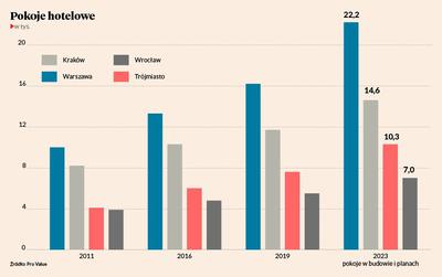 Aby zobrazować skalę zmian, przytoczył procentowy przyrost liczby hoteli. I tak: od 2011 r. podaż hoteli w Polsce wzrosła o około 35 proc. W Warszawie wzrost wyniósł 68 proc., w Trójmieście 60 proc., we Wrocławiu 42 proc., a w Krakowie 30 proc. Na najbliższe lata zapowiedziano kolejne otwarcia — tylko w Warszawie w obiektach w budowie i w planach znajduje się 6 tys. pokoi, a w Krakowie 3 tys., z czego większość ma funkcjonować pod międzynarodowymi i krajowymi markami.