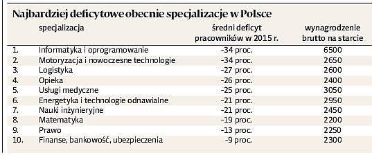 — Dynamiczny postęp technologiczny znajduje swoje odzwierciedlenie na rynku pracy. Średni deficyt informatyków i programistów sięga w tym roku 34 proc., a zarobki oferowane na start kariery nawet dwukrotnie przekraczają te, na które można liczyć w pozostałych branżach. Duże zapotrzebowanie dotyczy też fachowców z sektora motoryzacyjnego i nowych technologii — komentuje Krzysztof Inglot z Work Service.