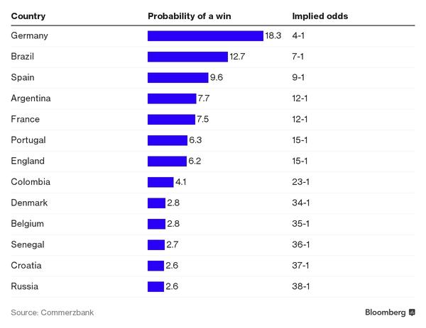 Analiza przeprowadzona przez Commerzbank uwzględnia światowe rankingi, wyniki poprzednich mistrzostw świata, stronniczość i liczbę bramek zdobytych w turnieju na przestrzeni lat. Gra w domu nie jest zaletą, którą kiedyś była. Szanse gospodarzy turnieju, Rosji oceniane są na zaledwie 2,6 proc. Aby uwzględnić przypadkową losowość w sporcie, Commerzbank przeprowadził 10 000 symulacji w przypadku każdej gry.