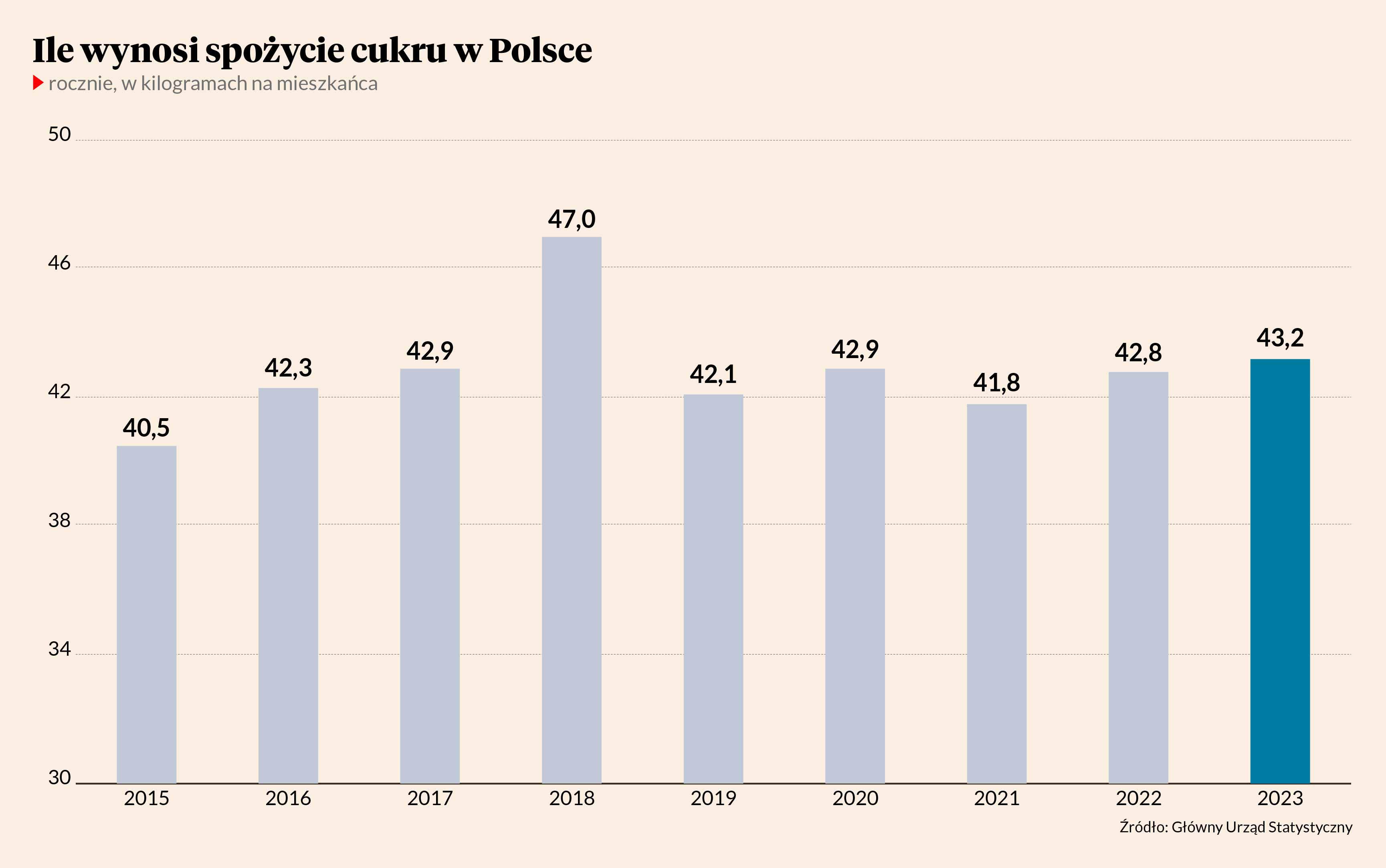 Dane GUS obejmują nie tylko bezpośrednią konsumpcję, ale też cukier wykorzystywany do wytwarzania innych produktów, np. napojów, a oficjalnym celem wprowadzenia podatku cukrowego w 2021 r. było ograniczenie spożycia właśnie napojów słodzonych.