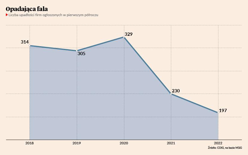 Dane sądowe za pierwszych sześć miesięcy tego roku potwierdzają, że szczyt upadłości firm za nami (w tym roku jest również znacznie mniej upadłości konsumenckich). W okresie styczeń-czerwiec 2022 r. sądy ogłosiły bankructwa 197 firm, czyli o ponad 14 proc. mniej niż rok wcześniej i aż o 40 proc. mniej niż w analogicznym okresie w 2020 r. Dlaczego zmniejsza się liczba upadłości mimo wielu niekorzystnych dla przedsiębiorców informacji płynących z rynku?