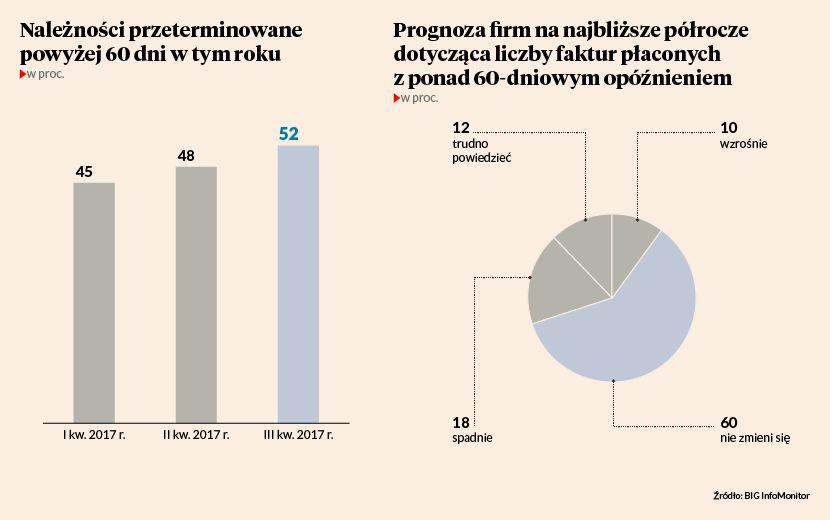 Ten wynik pokazuje, że przybywa podmiotów mających takie kłopoty. Po drugim kwartale tego roku odsetek respondentów sygnalizujących problemy z uzyskiwaniem swoich należności wynosił 48 proc., a po pierwszym — 45 proc. Obecnie o zaległych płatnościach informują przede wszystkim firmy małe, zatrudniające od 10 do 49 osób, a także średnie (liczące od 50 do 249 pracowników) oraz eksporterzy i spółki działające w handlu. Jednocześnie tylko 18 proc. badanych spodziewa się poprawy sytuacji. Natomiast według70 proc. ankietowanych liczba faktur regulowanych z opóźnieniem przekraczającym ponad 60 dni utrzyma się na dotychczasowym poziomie lub wzrośnie. Co ósmy przedsiębiorca nie wie, w którym kierunku zmieni się sytuacja.