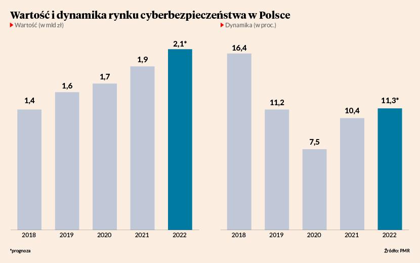 Powrót do dwucyfrowej dynamiki wydatków - takie są przewidywania PMR dla krajowego rynku cyberbezpieczeństwa. Zaczęły się spełniać już w ubiegłym roku - według szacunków firmy badawczej - po 7,5-procentowym wzroście (do 1,7 mld zł) rok wcześniej - w 2021 r. wydatki na ochronę przed cyfrowymi zagrożeniami zwiększyły się o 10,4 proc. do 1,9 mld zł. W niektórych obszarach wzrost rynku ograniczała tylko podaż, m.in. w związku z zakłóceniami łańcuchów dostaw.