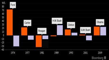 Stopy zwrotu ze złota (słupki pomarańczowe) oraz stopy zwrotu z indeksu S&P500 (słupki fioletowe), w pierwszym roku kadencji nowego prezydenta. Źródło: Bloomberg.