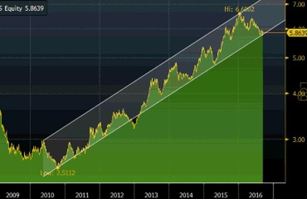 Odkąd w połowie stycznia relacja wartości jednostek funduszu ETF opartego na amerykańskim indeksie S&P500 oraz analogicznego funduszu opartego na wskaźniku MSCI Emerging Markets sięgnęła 6,6-krotności, najwyższego poziomu od 2004 r., obniżyła się o 11 proc. Dotarła w ten sposób do wsparcia w postaci dolnego ograniczenia kanału wzrostowego, opisującego trwającą od 2010 r. tendencję umocnienia giełdy nowojorskiej na tle rynków wschodzących.
