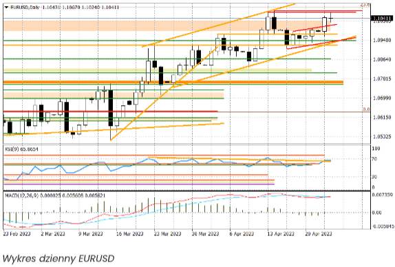 Poza wspomnianymi danymi z Richmond o godz. 16:00, dzisiaj uwagę przyciągną też dane nt. indeksu zaufania konsumentów Conference Board (o tej samej porze). Istotnym elementem rynkowej układanki mogą też być spekulacje wokół ruchu EBC w maju. Ostatnie komentarze przedstawicieli tej instytucji zaczynają przesuwać oczekiwania w stronę ruchu o 50 punktów baz. w maju i uzależnienia dalszych posunięć od napływających danych makro. Na razie szanse na większą podwyżkę stóp wynoszą 38 proc., zatem taki ruch nieco zmieniłby układ sił wokół EUR, biorąc pod uwagę to, że oznaczałby też to, że EBC mógłby zakończyć cykl w czerwcu przy 3,75 proc. Wiele w tym względzie mogą wnieść jeszcze spodziewane za kilka dni szacunki dotyczące kwietniowej inflacji.
