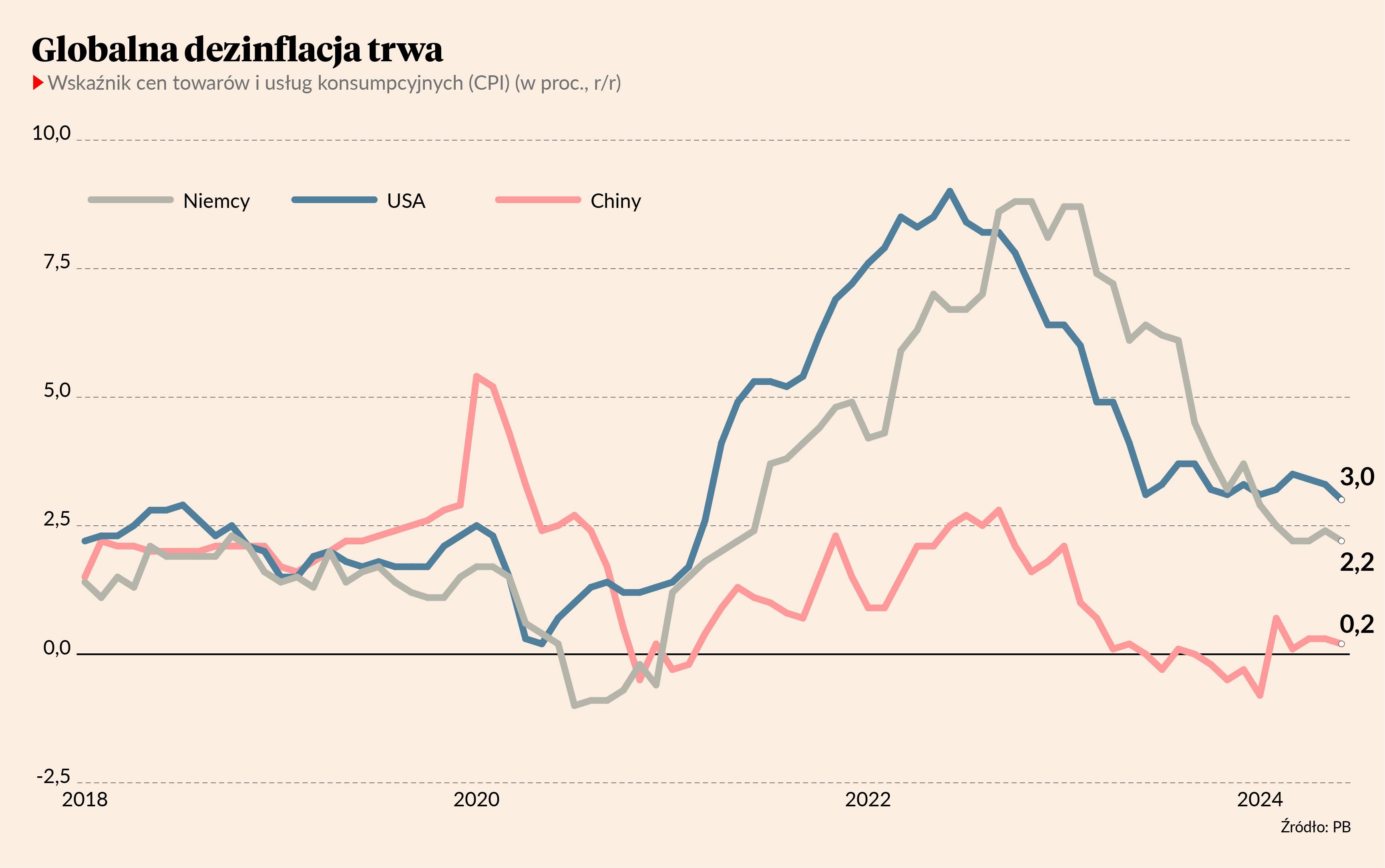 Z tych krajów ciekawe są Chiny, ponieważ tam — w przeciwieństwie do reszty świata — problemem jest za niska inflacja. Jest ona objawem niskiego popytu konsumentów i stagnacji wielu sektorów gospodarki. Wiele danych z Chin budzi wątpliwości co do wiarygodności, ale akurat dane inflacyjne ujawniają problemy tego kraju.