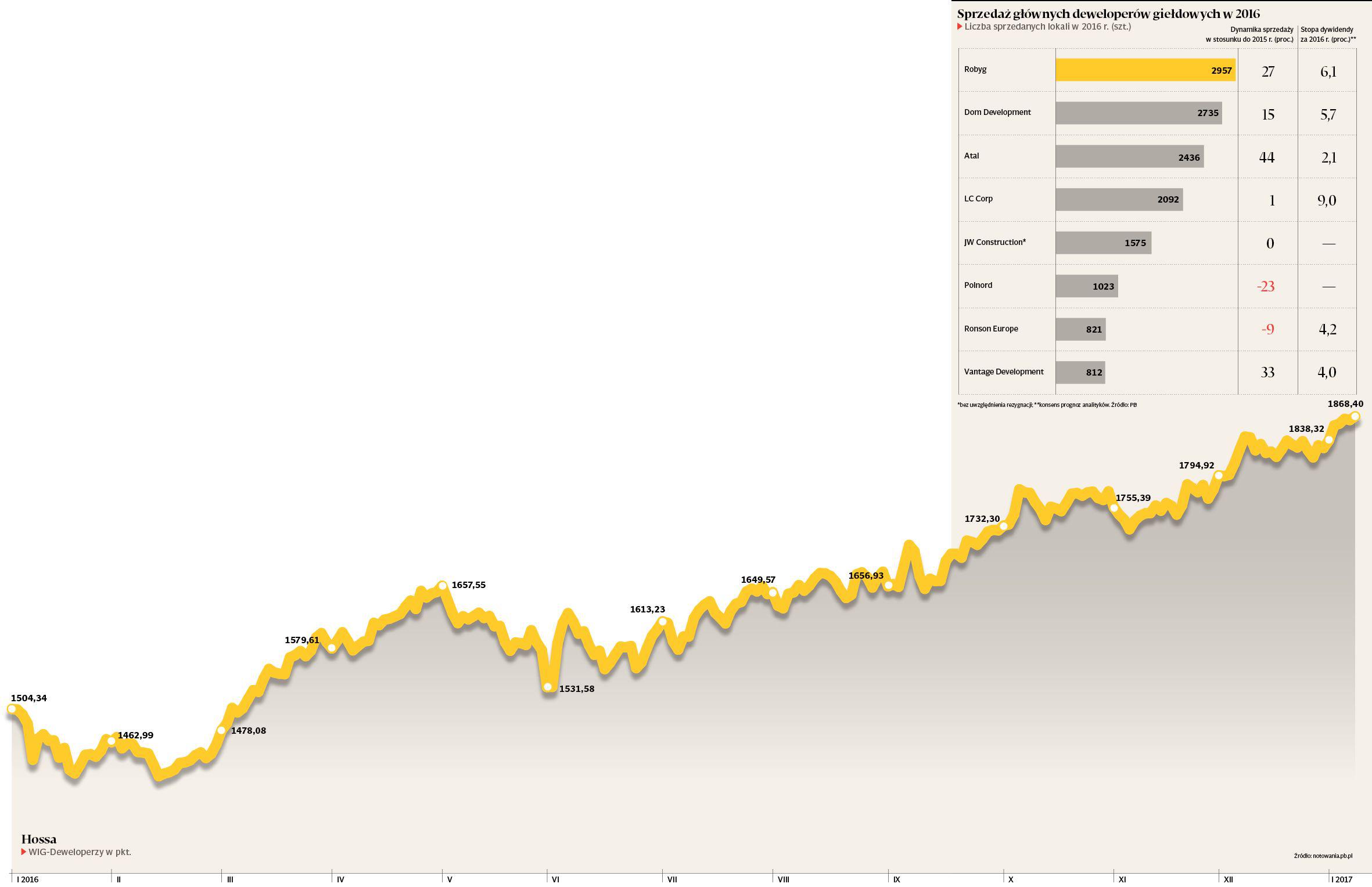 Archicom, Atal, LC Corp, Lokum Deweloper, Robyg, Vantage Development. Te nazwy usłyszeliśmy, pytając analityków o to, akcje którego dewelopera mieszkaniowego będą dobrą inwestycją w 2017 r. Szczodrość typów i brak zdecydowanego faworyta to pochodna tego, że w 2016 r. branża biła rekordy sprzedaży. Na dywidendy przeznacza zaś zazwyczaj 70-100 proc. zysku, a w sprzedaż mieszkań rozlicza w wynikach 2 lata po zawarciu umowy z kupującym.