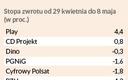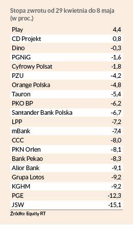 Wśród trójki najsłabszych spółek przełomu kwietnia i maja znalazło się także CCC. 29 kwietnia obuwnicza firma poinformowała, że według szacunków w I kwartale 2019 r. poniosła 155,5 mln zł straty. I choć inwestorzy przywykli do słabych otwarć roku w wykonaniu CCC, wynik ten był wyraźnie gorszy od konsensu prognoz analityków, który zakładał „tylko” 110,7 mln zł straty. Inwestorom nie spodobałysię także opublikowane po majówce dane za kwiecień, w których CCC pochwaliło się wzrostem przychodów o 20 proc. rok do roku.