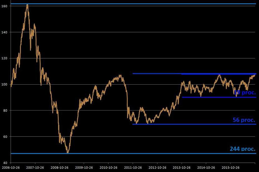 Poszczególne segmenty spółek notowały w ostatnich trzech latach wyraźne wahania – w okresie kryzysu ukraińskiego sWIG80 stracił od szczytu do dna ponad jedną czwartą wartości, polityczna bessa odchudziła WIG20 po uwzględnieniu dywidend o jedną trzecią, a od końca 2014 r. dający przybliżenie zachowania spółek spoza głównych indeksów indeks cenowy wzrósł do dzisiaj o 41 proc. Jednak mimo tych wahań warszawska giełda jako całość weszła w czwarty rok stagnacji, wynika z zachowania Wskaźnika Czterech Segmentów.