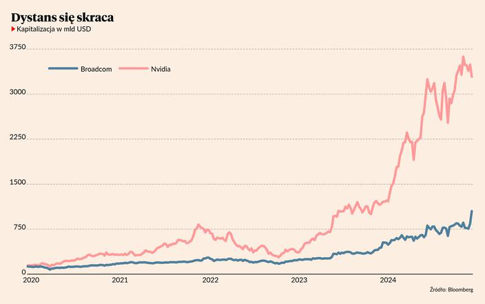 Dla inwestorów Broadcom nie jest jednak nową historią. To jeden z większych walorów płynących na fali mody na AI zapoczątkowanej debiutem nowej generacji ChatGPT jesienią 2022 r. Przez te dwa lata wartość rynkowa Broadcomu wzrosła z ok. 180 mld USD do prawie 850 mld USD w październiku 2024 r. Akcje spółki ważą 6,3 proc. w indeksie Nasdaq100 – czyli nawet więcej niż papiery Amazona - i na tym polu ustępują jedynie Nvidii, Microsoftowi oraz Apple’owi. Sama aprecjacja kapitałowa rzędu 370 proc. w nieco ponad dwa lata to kapitalny wynik. Lecz w tym samym okresie wartość Nvidii zwiększyła się przeszło 13-krotnie.