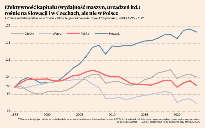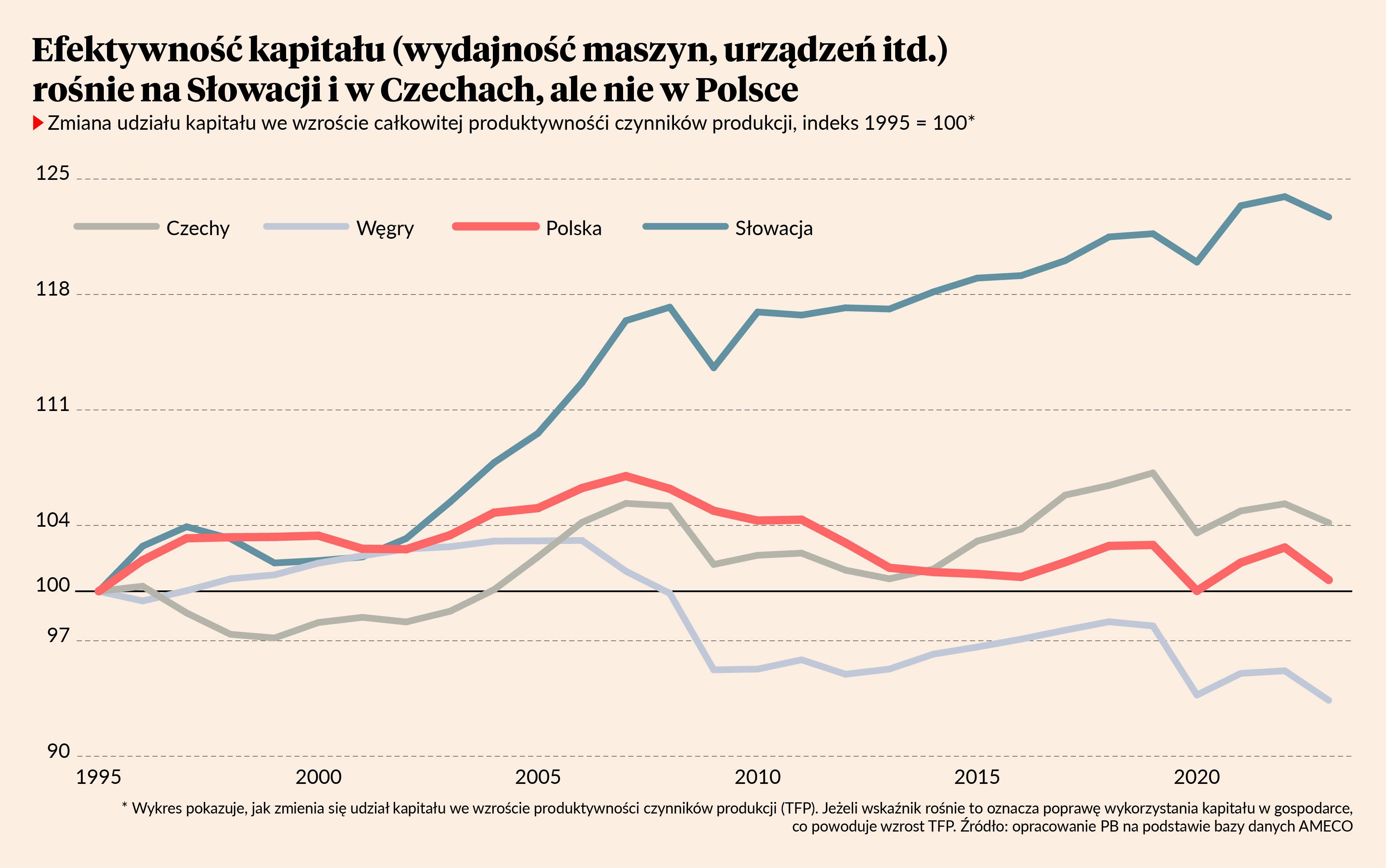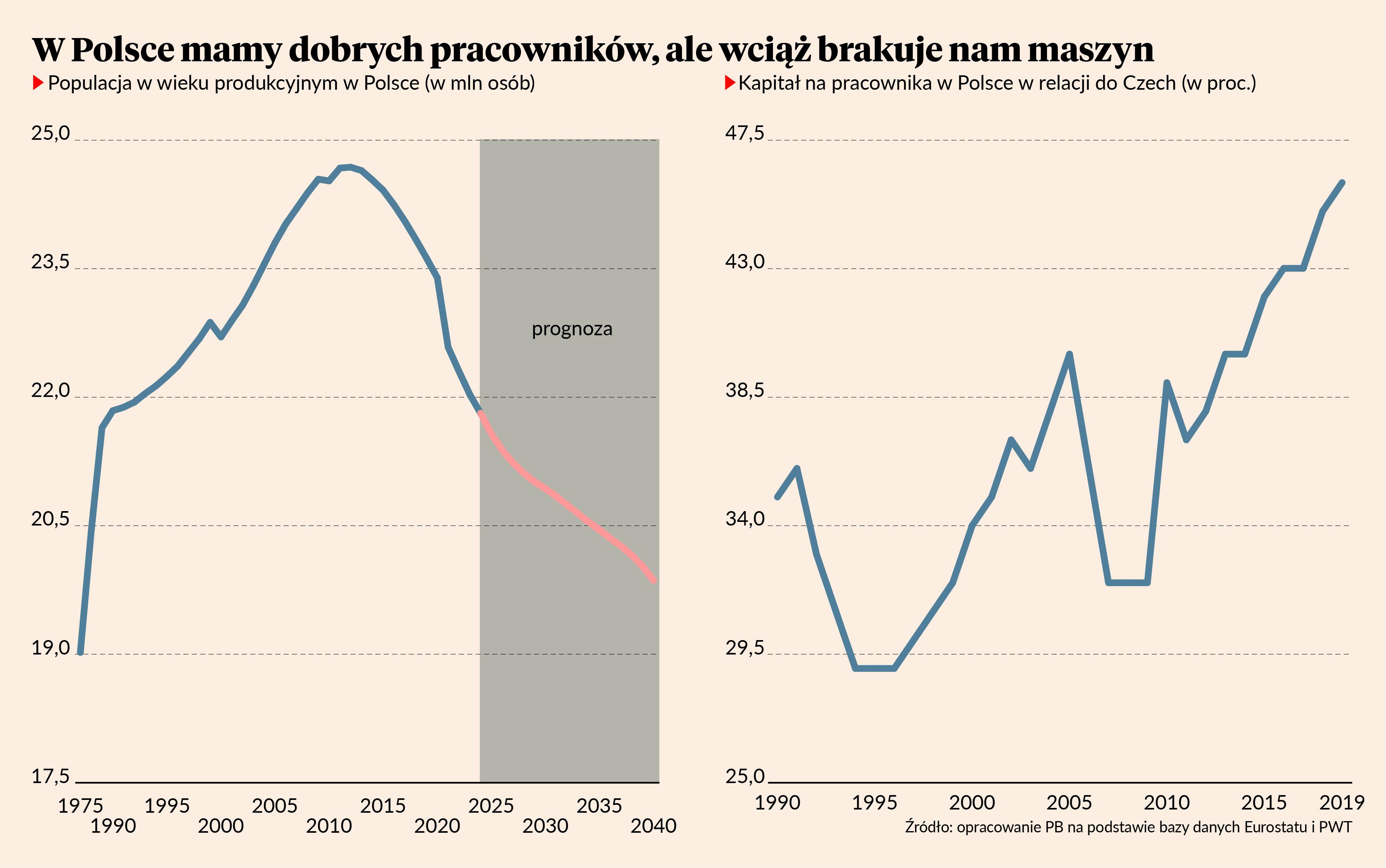 Tymczasem w Polsce wielkość kapitału przypadającego na pracownika jest niska, a jego wydajność nie rośnie. Gonimy wprawdzie Czechy, ale wciąż przeciętny pracownik w Polsce uzbrojony jest w dwukrotnie mniejszy zasób kapitału. To dlatego, że w Czechach liczba robotów, przypadających na 10 tys. pracowników, wynosi 189 a w Polsce 71. Kraj musi więc przede wszystkim zacząć szybciej akumulować kapitał, bo to sprawi, że jedną czynność wykonywać będzie nie kilku pracowników, ale tylko jeden, za to zasobny w narzędzia. Tym właśnie jest automatyzacja, którą powinna wymusić recesja demograficzna. W kolejnym etapie można podnosić efektywność kapitału (czyli sposób wykorzystywania maszyn) przez inwestowanie w te technologie produkcji, które są najbardziej zaawansowane.