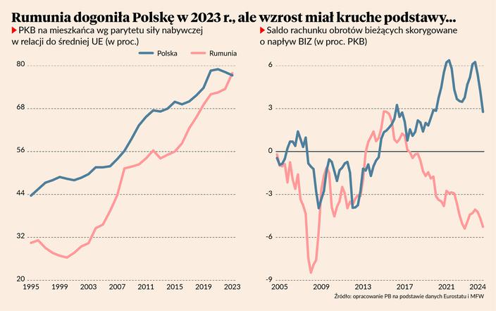 Polska i Rumunia to dwa państwa, które po wyjściu z otchłani systemu komunistycznego szybko gonią Europę Zachodnią. Nasza ścieżka tego pościgu wyróżnia się trwałością, natomiast rumuńska ścieżka imponuje dynamizmem. Według danych Eurostatu, jeszcze na początku XXI wieku PKB na mieszkańca Rumunii wyrażony w parytecie siły nabywczej (po uwzględnieniu różnic w poziomie cen) stanowił zaledwie 30 proc. średniej unijnej. W 2010 r. było to 52,4 proc., a w 2023 r. już 77,9 proc. W rezultacie kraj ten pierwszy raz we współczesnej historii przegonił Polskę* (nominalnie, czyli bez uwzględniania różnicy w poziomie cen, PKB na mieszkańca w Polsce jest wciąż wyższy), a informacja ta odbiła się szerokim echem w mediach.