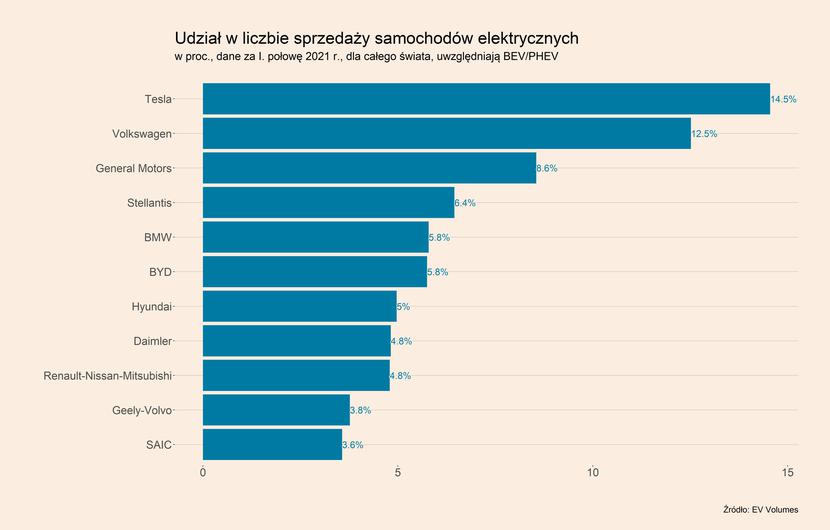 W zakresie pierwszego z wymienionych ryzyk, trzeba zauważyć, że niemal wszyscy najwięksi producenci samochodów spalinowych ogłosili datę zaprzestania sprzedaży takich aut i związane z tym gigantyczne inwestycje w rozwój technologii napędu elektrycznego. Część z nich posiada już dosyć znacząco rozbudowane portfolio pojazdów z takim napędem, co przekłada się na sprzedaż w tym obszarze. Przykładem może Volkswagen, który zgodnie z danymi EV Volumes w I półroczu br. był wiceliderem światowego rynku samochodów elektrycznych z udział na poziomie 12,5 proc., przy udziale Tesli na poziomie 14,6 proc. Wśród pozostałych firm w czołowej jedenastce pod względem liczby sprzedanych pojazdów, aż dziewięć firm stanowili tradycyjni producenci. Spośród producentów specjalizujących się w pojazdach elektrycznych, w czołówce sprzedaży, poza Teslą, znalazło się jedynie BYD.
