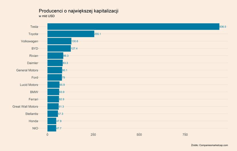 Analizując listę najwyżej wycenianych spółek motoryzacyjnych widać, że Tesla nie jest jednym przedstawicielem producentów specjalizujących się w obszarze pojazdów elektrycznych. Czwartą spółką w zestawieniu jest chińskie BYD (wycena na poziomie 127,4 mld USD), piąty jest amerykański Rivian (86,3 mld USD), dziewiąty jest również powstały w USA Lucid Motors (65,9 mld USD), a piętnasty NIO z siedzibą w Chinach (47,7 mld USD). Sumując te wyceny i dodając do nich wartość Tesli oznacza to, że pięciu producentów aut elektrycznych jest wartych o ponad 30 proc. więcej niż dziesięciu gigantów światowej motoryzacji.