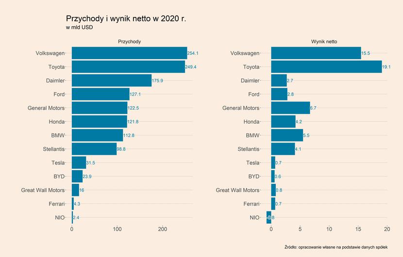 Jeszcze większe dysproporcje występują w zakresie wyniku netto porównywanych grup spółek. W 2020 r. Tesla po raz pierwszy w skali roku osiągnęła zysk netto, który wyniósł trochę ponad 0,7 mld USD, BYD zanotowało zysk na poziomie 0,6 mld USD, a NIO stratę netto w wysokości prawie 0,8 mld USD. Z drugiej strony, Toyota osiągnęła zysk w wysokości 19,1 mld USD, Volkswagen 15,5 mld USD, a Daimler 2,7 mld USD, GM zysk na poziomie 6,7 mld USD, a Ford 2,8 mld USD.