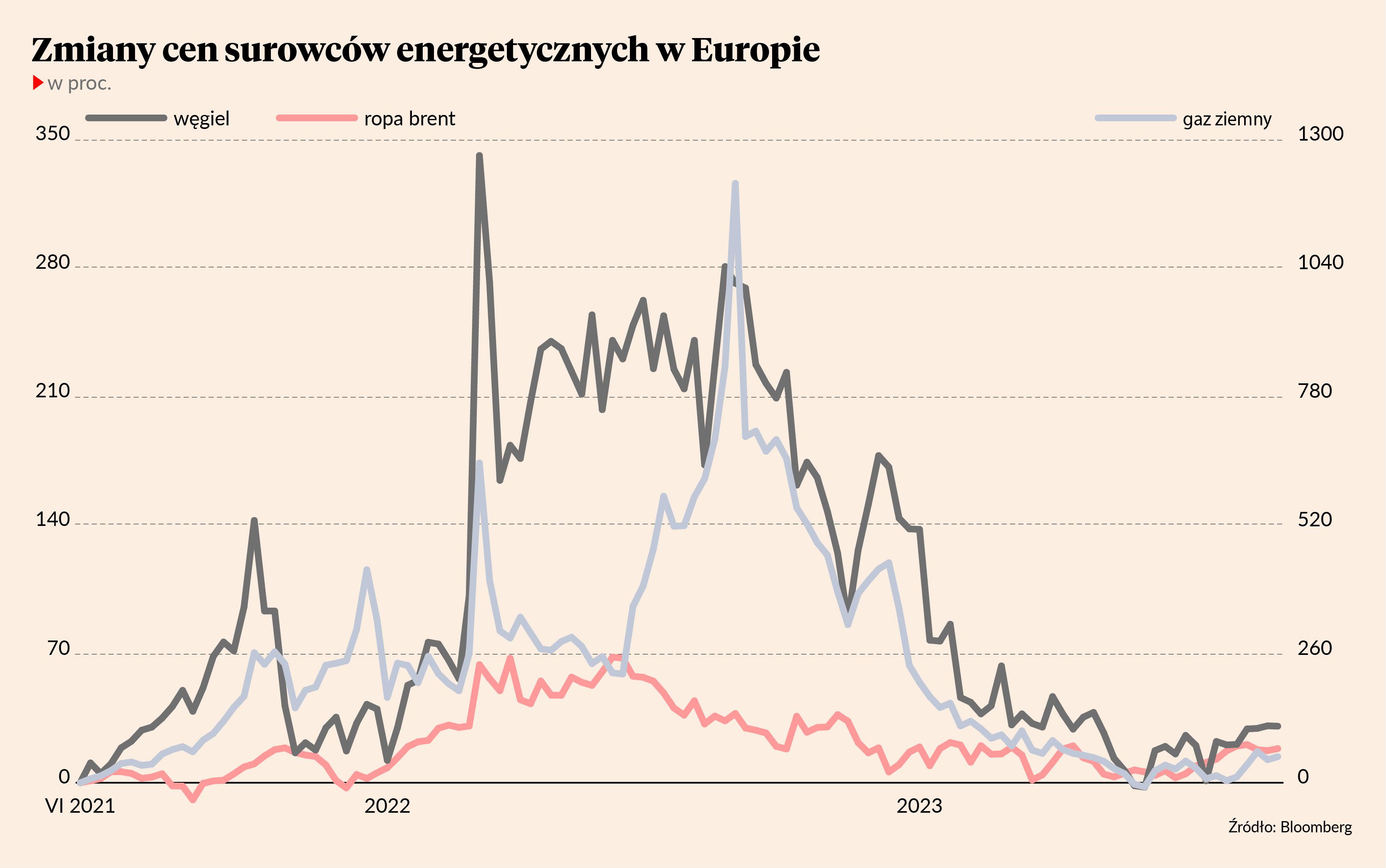 Niespokojny pozostaje także rynek węgla energetycznego. Węgiel w szczycie paniki po wybuchu wojny rosyjsko-ukraińskiej kosztował w Rotterdamie ponad 450 USD za tonę. Jesienią 2022 r. zaczął szybko tanieć, a jego ceny w Europie pod koniec maja spadły do niespełna 90 USD za tonę. Obecnie kosztuje ok. 125 USD/t. Jest zatem o prawie połowę droższy niż jeszcze trzy miesiące temu i zarazem o 63 proc. tańszy niż rok temu, gdy był wyceniany na ponad 350 USD/t.