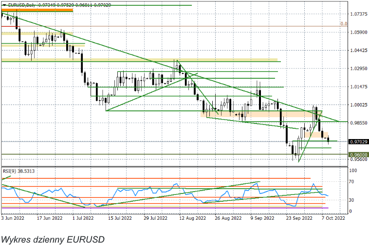 Notowania EURUSD spadły dzisiaj w okolice 0,97 oddalając się tym samym od okolic bliskich parytetu, jakie miały miejsce w zeszłym tygodniu. Potwierdza to tylko tezę, że trend spadkowy w średnim terminie jest silny i na razie nie widać mocnych przesłanek za jego zmianą. W krótkim terminie rynek może szukać punktu równowagi, chociaż niewiele to zmieni w perspektywie kolejnych tygodni. Uwagę zwracają komentarze członków ECB podkreślających konieczność podwyżek stóp procentowych - "jastrzębi" Klaas Knot stwierdził, że rynki nie wyceniają możliwej skali podwyżek w 2023 r., a te mogą być znaczące. Teoretycznie powinny być to dobre informacje dla euro, gdyby nie to, że FED robi to samo, co "zamierza" zrobić EBC, który jest w znacznie słabszej pozycji (europejska gospodarka wejdzie w recesję szybciej, niż amerykańska). W krótkim okresie ważne dla dolara będą publikacje z USA ze środy i czwartku (zapiski FED i inflacja CPI), które teoretycznie mogą stworzyć preteksty do jakiejś krótkiej korekty amerykańskiej waluty (choć nie muszą).