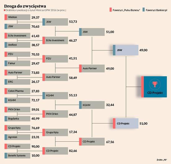 Dziennikarze i analitycy „Pulsu Biznesu” i serwisu Bankier.pl wytypowali pod koniec 2016 r. 16 spółek, z których internauci wyłonili ich zdaniem najlepszą w minionym roku. Zasady były proste: do kolejnej rundy przechodził ten, kto zbierał więcej internetowych głosów. Do finału doszły CD Projekt i Jastrzębska Spółka Węglowa (JSW), a po wyrównanej walce zwycięzcą została ta pierwsza. Po drodze do ostatecznej rozgrywki trzeba było pokonać trzech konkurentów. CD Projekt w dwóch pierwszych rundach nie miał większych problemów i z dużą przewagą odprawił Benefit Systems (90 proc. głosów na CD Projekt) oraz Grupę Kęty (83 proc.). Nieco bardziej zacięty był półfinał, w którym producent „Wiedźmina” zmierzył się z generałem grudniowej hossy — KGHM. CD Projekt zebrał w tym starciu 68 proc.