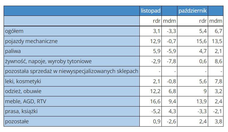 Listopadowe wyniki wskazują na utrzymującą się poprawę popytu konsumpcyjnego w ujęciu rocznym, choć jednocześnie widoczne jest sezonowe osłabienie sprzedaży w porównaniu z październikiem.