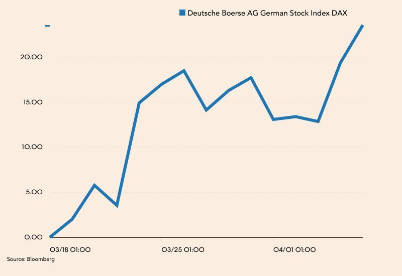 DAX znalazł się 20 proc. powyżej minimum z zamknięcia sesji 18 marca. Indeks, w skład którego wchodzi trzydzieści niemieckich blue chipów, odrabiał straty m.in. dzięki rosnącej nadziei słabnięcia pandemii koronawirusa. Od dołka najmocniej poszły w górę kursy Fresenius SE & Co. (38 proc.), Deutsche Post (36 proc.) i Siemensa (35 proc.).