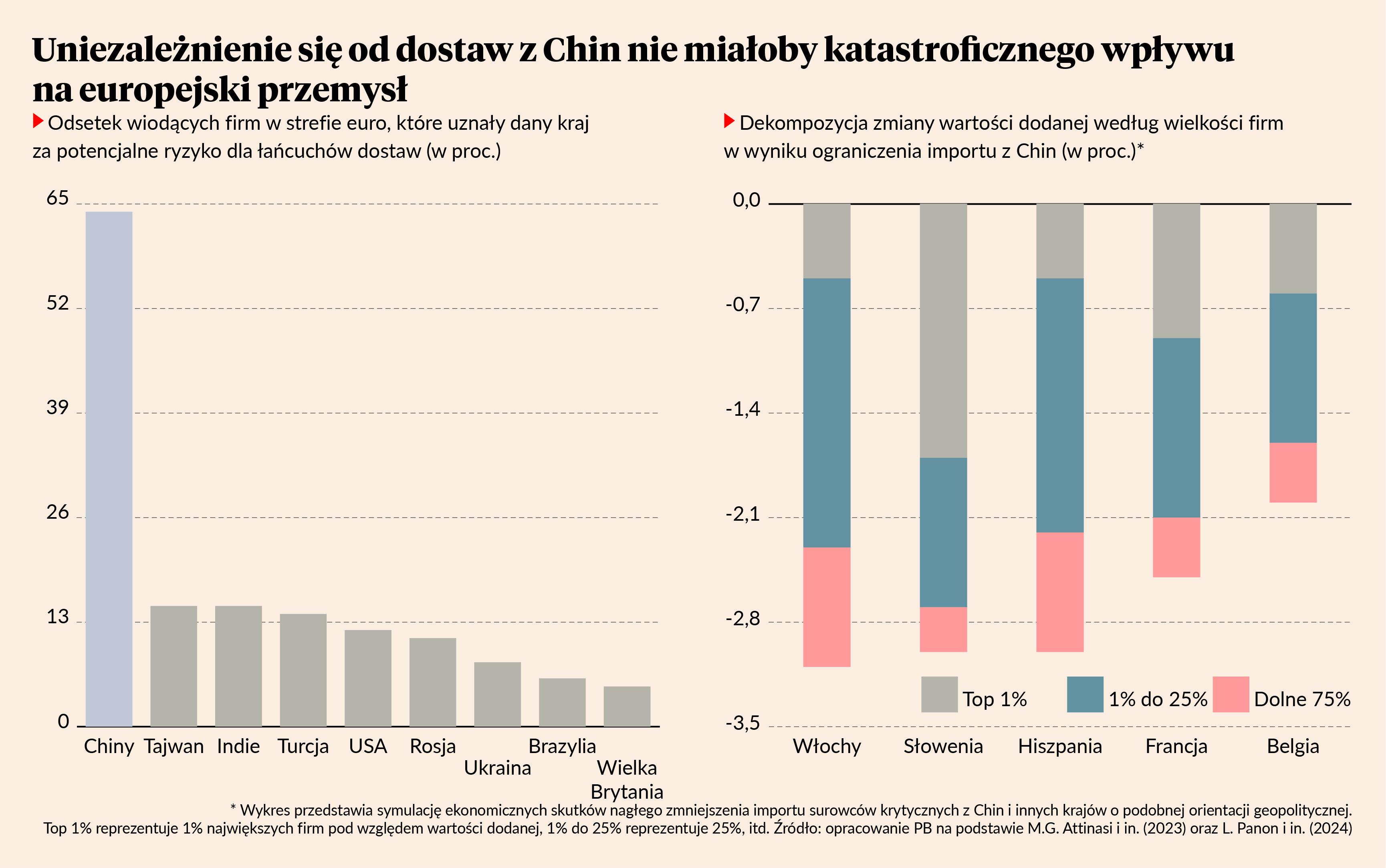 Pierwszy argument znajduje oparcie w badaniach naukowych. Ekonomiści Europejskiego Banku Centralnego w publikacji „Inputs in distress: geoeconomic fragmentation and firms' sourcing” oszacowali wpływ 50-procentowej redukcji importu surowców krytycznych z Chin i krajów o zbliżonej orientacji geopolitycznej. Analiza objęła pięć państw UE, które odpowiadają za ponad 40 proc. unijnego PKB. Według wyliczeń wartość dodana w przemyśle zmniejszyłaby się w różnym stopniu: od 2 proc. w Belgii przez 2,5 proc. we Francji do 3 proc. w Hiszpanii i Słowenii oraz 3,1 proc we Włoszech. Najsilniej odczułyby to branże produkujące sprzęt elektryczny (spadek o 6,5 proc.), wyroby chemiczne (4 proc.) oraz maszyny i urządzenia (4 proc.). Biorąc pod uwagę, że udział chińskiego importu komponentów krytycznych w Polsce plasuje się między poziomem belgijskim a słoweńskim, można orientacyjnie przyjąć, że spadek wartości dodanej w polskim przemyśle wyniósłby 2,5-3 proc.
