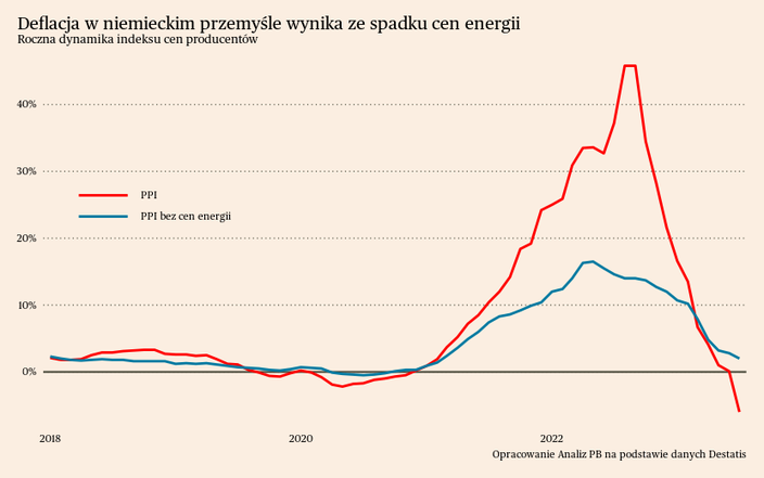 W Niemczech bardzo wyraźnie widać, że szoki cenowe nie rozchodzą się równomiernie w gospodarce. Na początku kryzysu energetycznego najszybciej zareagowały ceny dóbr energochłonnych, w większości dóbr pośrednich. Dopiero później presja cenowa przeszła się na dobra końcowe, które kupują konsumenci, a jeszcze później na usługi. Obecnie zachodzi to samo zjawisko, ale w przeciwnym kierunku. Na początku łańcucha jest teraz spadek cen energii, który oddziałuje na ceny dóbr energochłonnych. Dopiero w przyszłości przełoży się to na resztę gospodarki.