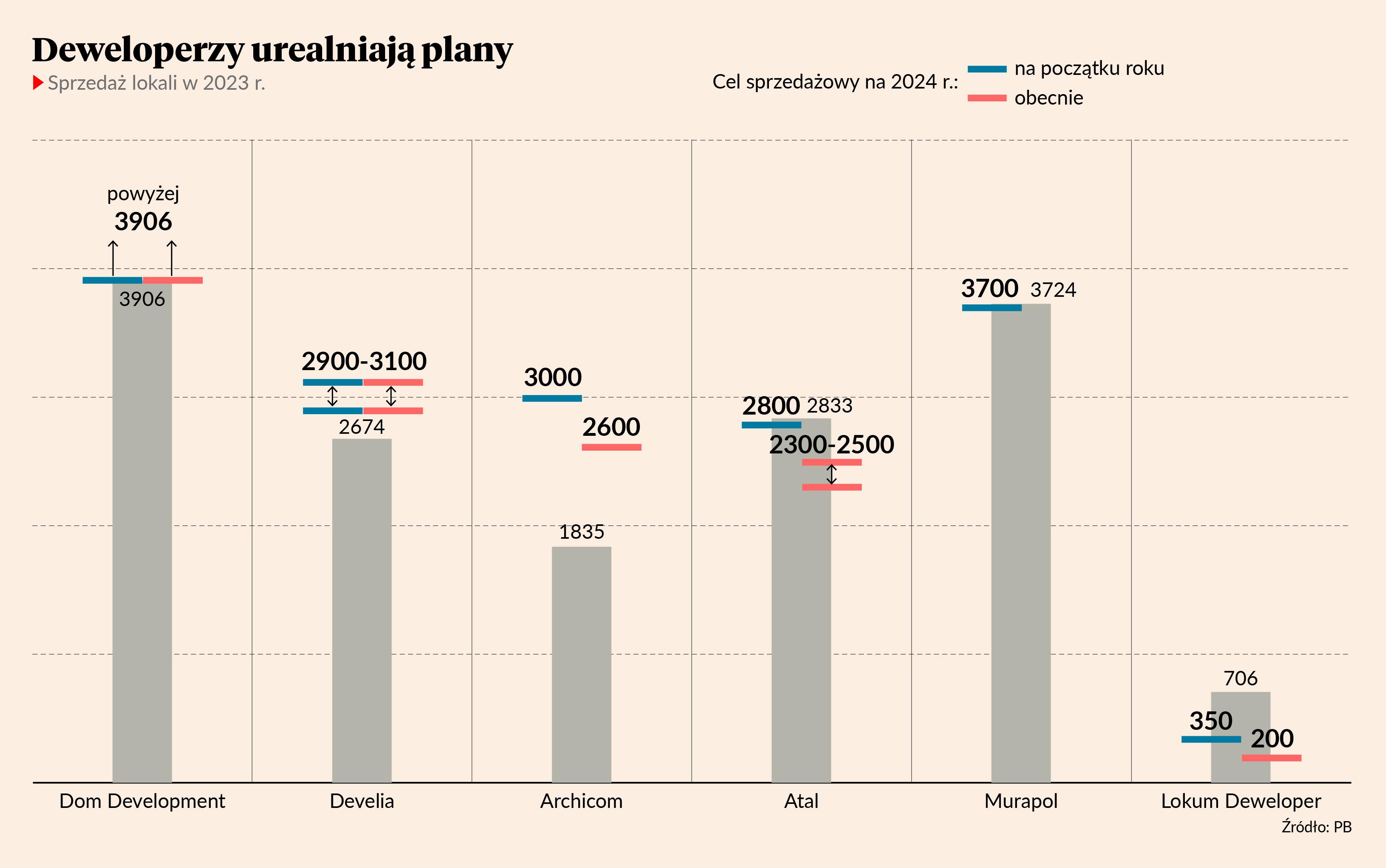 Rewizję celów sprzedaży przeprowadziły już Archicom, Atal oraz Lokum Deweloper. W przypadku dwóch pierwszych spółek spadek wyniósł kilkanaście procent, natomiast Lokum Deweloper obniżył swoje oczekiwania aż o 40 proc.