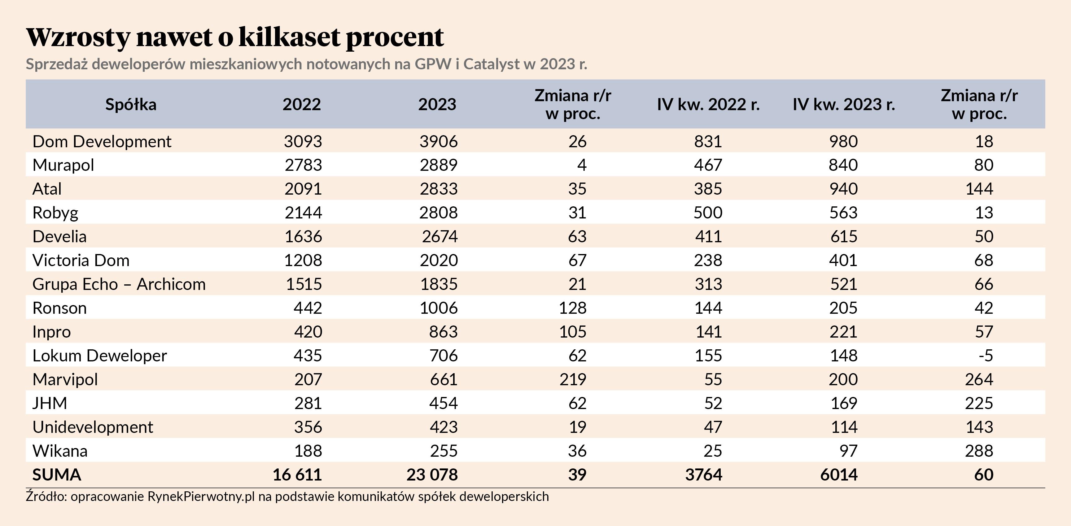 Wyniki sprzedażowe czternastu spółek deweloperskich notowanych GPW i Catalyst były w IV kw. 2023 r. aż o 60 proc. wyższe niż w IV kw. 2022, a w całym roku o 39 proc. niż rok wcześniej — wynika z zestawienia portalu RynekPierwotny.pl. W przypadku pięciu spółek wzrost był nawet trzycyfrowy.