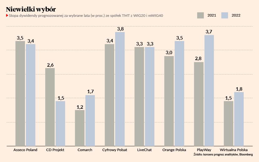 Orange Polska po raz ostatni wypłacił dywidendę w 2016 r. Niektórzy analitycy spodziewali się, że część zysku trafi do akcjonariuszy w tym roku, ale ostatecznie tak się nie stało. Firma planuje wrócić do wypłat w 2022 r. Analitycy zakładają, że będzie to 0,25 zł na akcję, a konsensus na kolejny rok to 0,29 zł. Oznacza to stopę dywidendy na poziomie 3-3,5 proc., a więc zbliżoną do charakteryzującej Cyfrowy Polsat. Podobne wskaźniki ma Asseco Poland, a z mniejszych spółek technologicznych z mWIG40 tylko LiveChat Softoware. Reszta (jak WP, Comarch, CD Projekt, PlayWay) jeśli będzie płacić dywideny, to raczej niższe niż spodziewane do tej pory po Cyfrowym. Ze spółek z WIG20 i mWIG40, a więc tych na radarach dużych funduszy, bardziej atrakcyjne dywidendowo są spółki z sektora finansowego, ale siłą rzeczy nie są one w grupie porównawczej (nawet rozszerzonej) dla Cyfrowego Polsatu.
