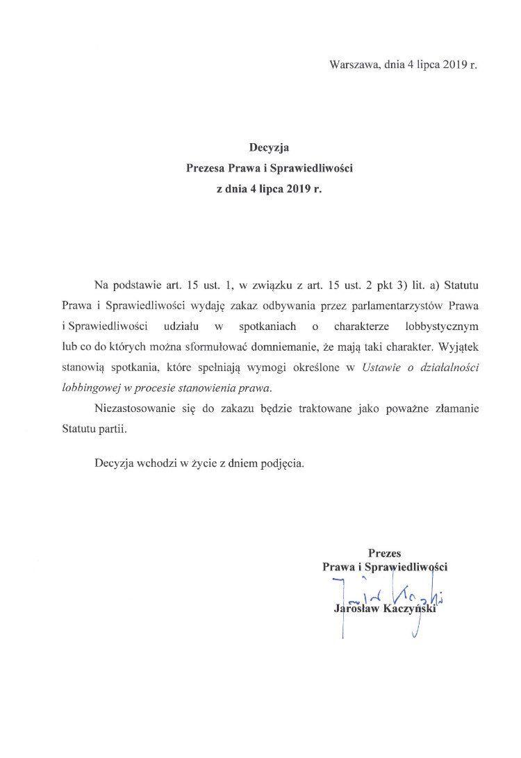 Wydał „zakaz odbywania przez parlamentarzystów PiS udziału w spotkaniach o charakterze lobbystycznym, lub co do których można sformułować domniemanie, że mają taki charakter”.