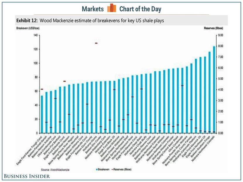 Progi ceny ropy, przy których opłacalność osiąga wydobycie surowca w poszczególnych zagłębiach (słupki niebieskie, skala lewa), na tle wielkości dostępnych tam rezerw (kreski fioletowe, skala prawa). Źródło: Morgan Stanley, BusinessInsider.