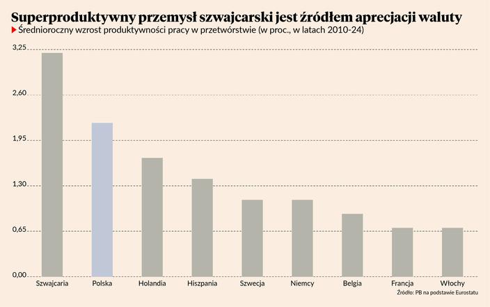Szwajcaria jest krajem o bardzo nowoczesnym przemyśle, skoncentrowanym w sektorach wysokich technologii, który systematycznie i w wysokim tempie zwiększa produktywność. W ciągu ostatnich 14 lat średnioroczny wzrost produktywności pracy w przetwórstwie wynosił w Szwajcarii aż 3 proc., podczas gdy w Niemczech było to 1,1 proc., we Francji i Włoszech 0,7 proc. (w Polsce wzrost też był wysoki, ale poziom produktywności, czyli punkt wyjściowy, jest dużo niższy). To sprawia, że szwajcarska waluta jest coraz droższa, ponieważ kraj notuje systematycznie wysoką nadwyżkę handlową.