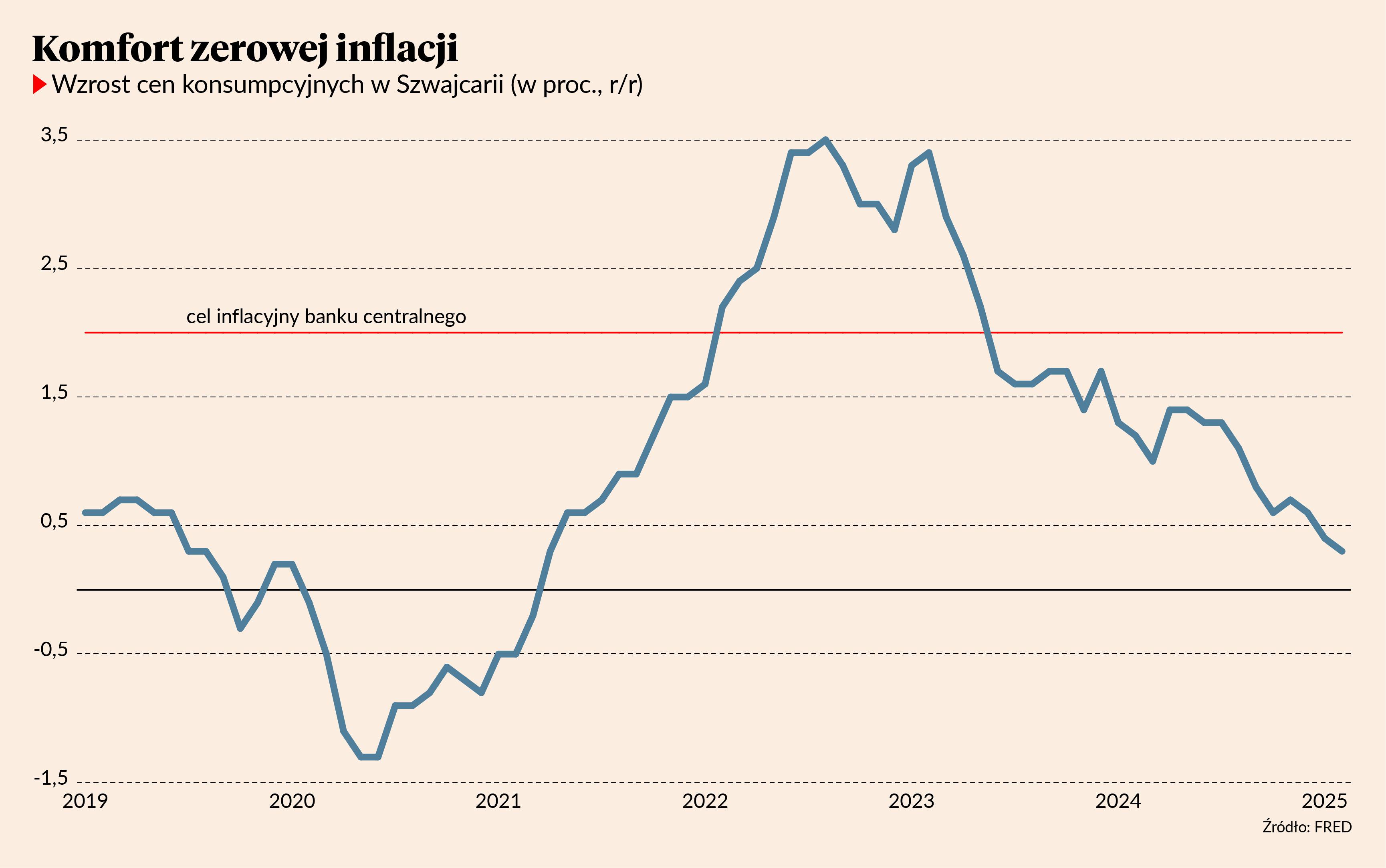 Interesujące jest pytanie, jakim cudem Szwajcaria utrzymuje bardzo niską inflację w erze, gdy inne kraje wciąż zmagają się z podwyższoną dynamiką cen? Te 0,3 proc. to tyle, ile tuż przed pandemią. A tymczasem inflacja w strefie euro wynosi 2,4 proc. USA 2,8 proc., w Wielkiej Brytanii 3 proc. Wszędzie inflacja jest niższa niż w ostatnich dwóch latach, ale wciąż wyższa niż cele inflacyjne banków centralnych. A Szwajcaria wróciła na granicę deflacji.