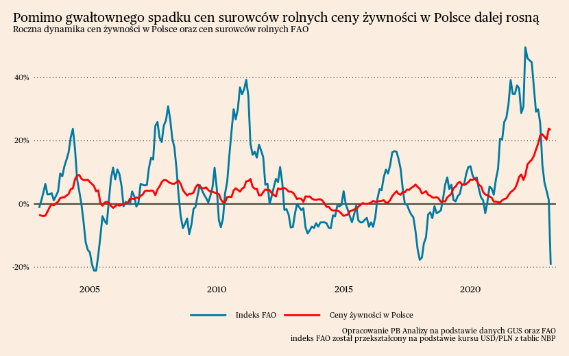 Od kilku miesięcy na świecie i w Polsce sukcesywnie spadają ceny surowców rolnych. Światowy indeks cen surowców rolnych FAO spadł w lutym o 8,9 proc. w porównaniu do lutego 2022. Spadki cen surowców rolnych pogłębiły się jeszcze bardziej w marcu. Mimo tego ceny żywności w sklepach rosną coraz szybciej niż ogół cen wskazywany przez inflację CPI. W marcu ceny żywności oraz napojów we wskazaniu indeksu CPI wzrosły o 19 proc. r/r, wyraźnie wyżej niż ogólny wzrost cen, który wyniósł 14,4 proc. Nie jest to pierwsze takie wskazanie, w poprzednich miesiącach było podobnie.