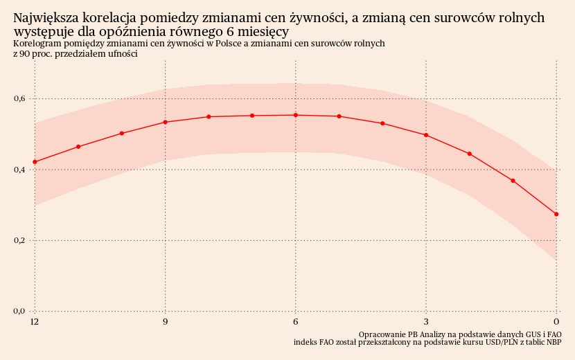 Patrząc z szerszej perspektywy, dane z ostatnich kilkunastu lat wskazują, że ceny detaliczne produktów spożywczych były najbardziej skorelowane ze zmianami hurtowymi sprzed 6 miesięcy. Inaczej mówiąc, dzisiejsza zmiana indeksu cen surowców jest najbardziej skorelowana ze zmianami indeksu cen produktów spożywczych za pół roku.