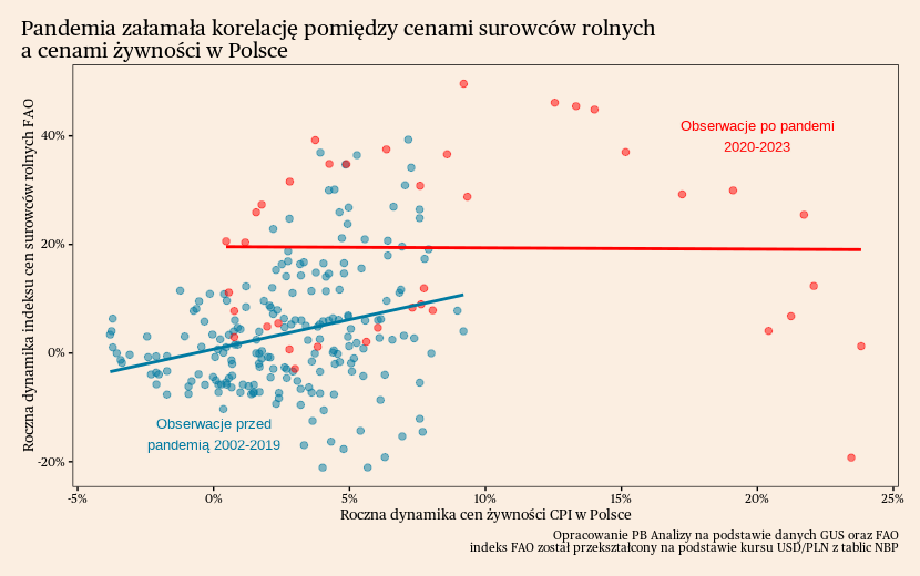 Patrząc historycznie korelacja pomiędzy roczną dynamiką cen detalicznych żywności, a roczną dynamiką indeksu FAO nigdy nie była bardzo wysoka. To wskazuje, że inne czynniki niż koszty surowców miały wpływ na ceny w sklepach. Nie zaskakuje zatem, że po pandemii korelacja została złamana, gdyż inne czynniki cenotwórcze zyskały na znaczeniu: lockdowny, zaburzenia w dostawach, niedostępność nowych maszyn produkcyjnych, wojna za wschodnią granicą i wywołany nią odpływ pracowników.