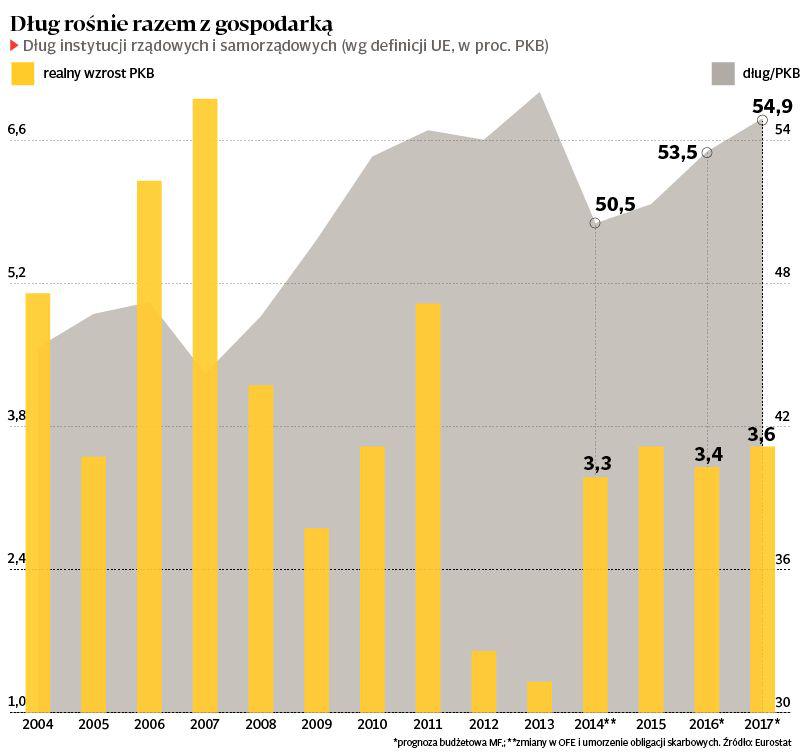 Perspektywy zadłużenia rysują się w ciemnych barwach nie tylko przez słabośćzłotego. Za ponad 85 proc. długu odpowiada zadłużenie skarbu państwa. To zaś ma w tym roku zwiększyć się o prawie 80 mld zł, a w przyszłym o kolejne 71,3 mld zł. W ten sposób pod koniec 2017 r. skonsumowane zostanie niemal wszystko, co poprawiło nam statystyki po umorzeniu obligacji skarbowych z portfeli OFE. Wówczas dług sektora instytucji rządowych i samorządowych spadł z 56 proc. w 2013 r. do 50,5 proc. rok później. Eksperci zwracają uwagę na to, że nawet dynamika wzrostu nie podziała kojąco na statystyki