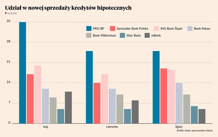 Bardzo wysoka dynamika napływu aplikacji kredytowych nie przekłada się na razie na układ sił na rynku hipotecznym. Dotarliśmy do danych o sprzedaży kredytów mieszkaniowych w lipcu, z których wynika, że rządowy program nie poprawił pozycji państwowych banków w zestawieniu największych kredytodawców. Liderem, tu nie ma żadnej niespodzianki, był PKO BP. Co czwarty kredyt mieszkaniowy zaciągnięty na rynku pochodził z tego banku. Na drugim miejscu uplasował się Santander. I to jest pewna niespodzianka, bo wyprzedził dotychczasowego wicelidera, czyli ING Bank Śląski, który w lipcu był trzeci. Różnice między nimi nie są duże — Santander miał ponad 19 proc. udziałów w nowej sprzedaży, a ING 18,7 proc.