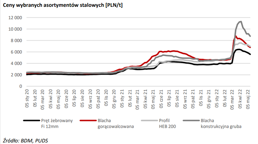 Jednocześnie ceny podstawowych asortymentów stalowych wciąż są ok. 40 proc. powyżej stanu sprzed wybuchu wojny (ok. +170 proc. r/r).