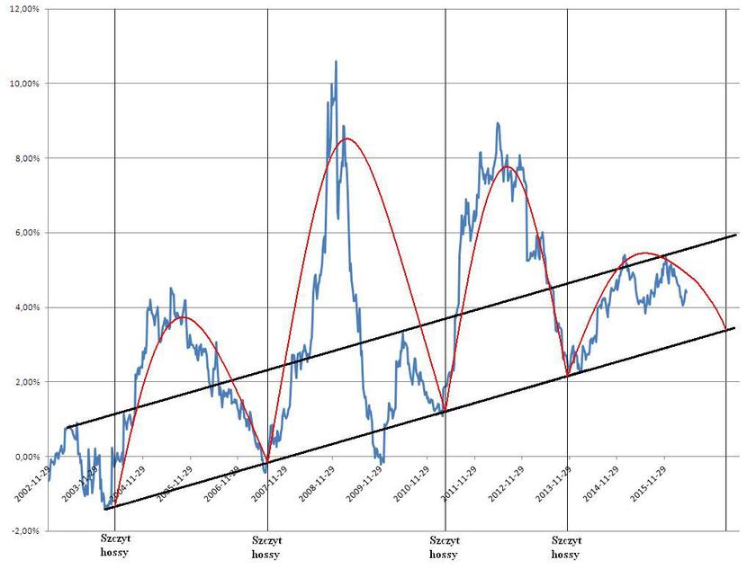 Choć po kilkunastu latach utrzymywania się takiej tendencji akcje można uznać za relatywnie niedowartościowane na tle obligacji (a więc posiadające większy potencjał umocnienia), to jednak z punktu widzenia analizy technicznej należy założyć, że wysokość premii pozostanie wewnątrz kanału, czyli nie przełamie jego dolnego ograniczenia (znajduje się ono obecnie na wysokości 3,1 punktu proc.). W ramach tej długoterminowej tendencji występują jednak znaczne wahania, wpisujące się w trwający przeciętnie 40 miesięcy podstawowy cykl koniunkturalny.