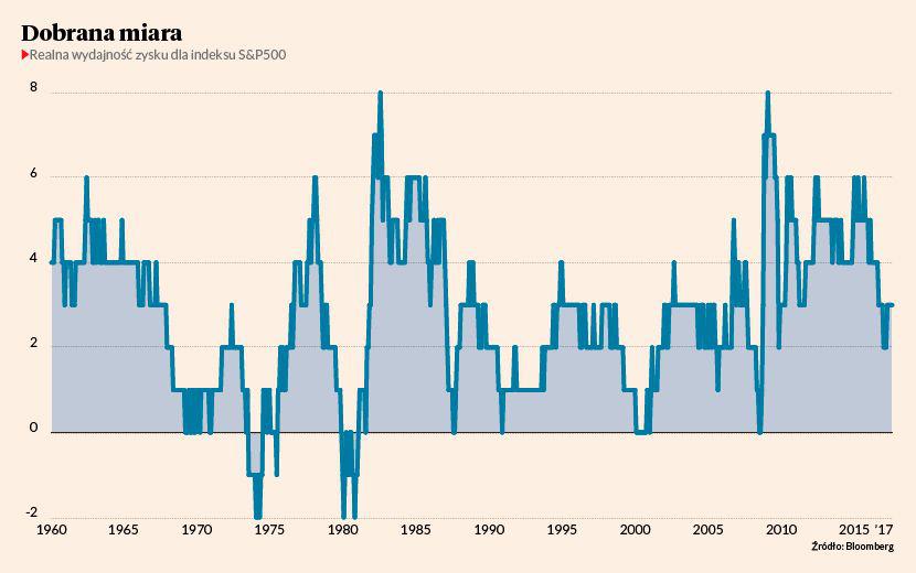 Im niższa wartość, tym większe przewartościowanie akcji — tak jak na przełomie wieków i w 2008 r., kiedy pękały bańki internetowa i hipoteczna. Po ostatnim krachu wskaźnik wzrósł do 8, odzwierciedlając skrajnie niskie wyceny akcji. Była to wówczas dobra okazja do kupna.