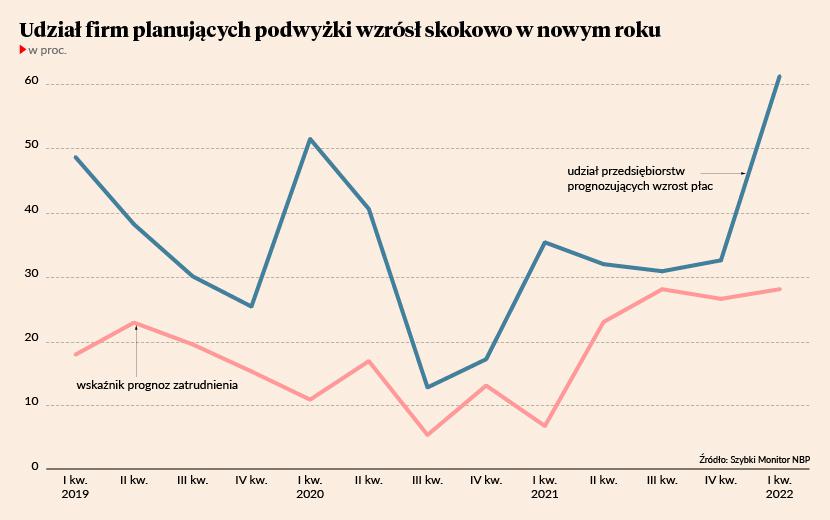 Rynek pracy jest wyjątkowo rozgrzany. Historycznie wysoki jest zarówno udział firm prognozujących zwiększenie zatrudnienia w kolejnym kwartale, jak i odsetek przedsiębiorstw mających wakaty, wynika z badania Szybki Monitor przeprowadzonego przez NBP. Wysoki popyt na pracę oraz przyspieszająca inflacja (w styczniu wyniosła 9,2 proc.) sprzyja nasileniu presji płacowej. Odsetek firm deklarujących narastanie presji na wzrost wynagrodzeń w IV kw. 2021 r. wzrósł o 10 pkt proc. kw./kw., do najwyżej notowanego dotąd poziomu – 37 proc.