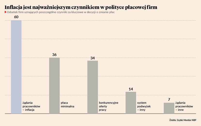 Ok. 60 proc. przedsiębiorców planujących podwyżki wynagrodzeń w kolejnym kwartale ocenia, że kluczowym czynnikiem zmiany płac są żądania pracowników motywowane inflacją. Blisko o połowę niższy odsetek respondentów wskazuje na zmiany poziomu płacy minimalnej czy presję motywowaną konkurencyjnymi ofertami pracy.
