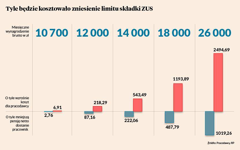 Łukasz Kozłowski, główny ekonomista Pracodawcy RP, nie ma złudzeń — zniesienie limitu mocniej uderzy w pracodawcę. — Pracownik zapłaci niższą składkę zdrowotną i niższy podatek dochodowy, bo wyższa składka emerytalno-rentowa obniży mu podstawę. Ponadto, o ile składką emerytalną pracodawca z pracownikiem dzielą się po równo, to składkę rentową finansuje głównie pracodawca — pracownik płaci składkę 1,5 proc., a pracodawca 6,5 proc. — tłumaczy Łukasz Kozłowski.