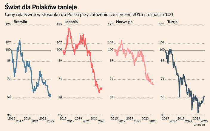 Jeżeli relację cen w danym kraju do cen w Polsce na początku 2015 r. przyjmiemy jako 100, to dziś wynoszą one 59 w Japonii, 70 w Brazylii i Norwegii oraz 56 w Turcji. Przy czym np. Turcja najbardziej taniała w stosunku do Polski przed 2020 r. z powodu dużej deprecjacji liry, a potem przestała tanieć z powodu wysokiej inflacji. Z kolej Japonia najbardziej taniała w stosunku do Polski od 2023 r. z powodu aprecjacji złotego, wysokiej inflacji w Polsce i deprecjacji jena.
