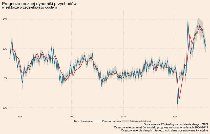 Model statystyczny wskazuje, że obecnie przychody przedsiębiorstw rosną w coraz wolniejszym tempie, choć wciąż jest to dynamika znacznie wyższa od średniej historycznej. Ostatnie dane makro sugerują, że przychody powinny rosnąć obecnie w tempie ok. 20 proc. rok do roku (+/- 5 pkt proc.), czyli mniej niż 30 proc. notowane na podstawie faktycznych danych w trzecim kwartale 2022 r. Spowolnienie to głównie jest to wynik hamującej inflacji (szczególnie hurtowej), która oznacza, że przedsiębiorstwa wolniej podnoszą ceny. Dodatkowo ochłodzenie koniunktury daje przedsiębiorstwom mniejszą przestrzeń na podwyżki cen oraz hamuje wolumen sprzedaży.