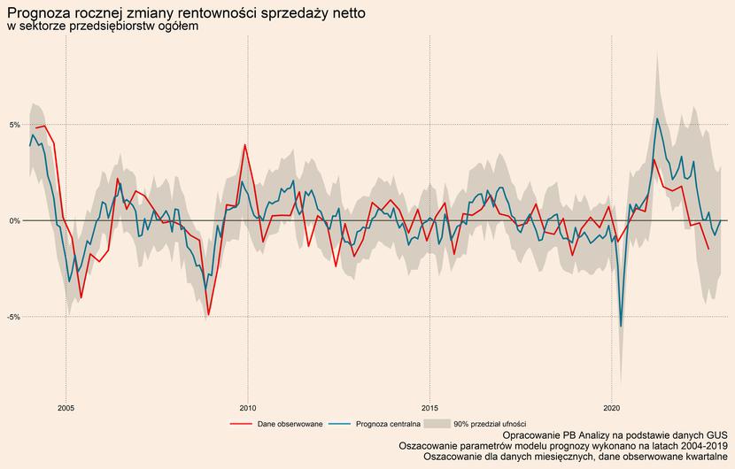 Model statystyczny wskazuje, że na razie rentowności nie wykazują istotnego trendu wzrostowego lub spadkowego. Roczna zmiana rentowności wynosi ok. 0 (+/- 3 pkt proc.). Może to oznaczać dwie rzeczy. Po pierwsze, że w poszczególnych sektorach gospodarki sytuacja wygląda skrajnie różnie, stąd istotniejsze dla rentowności przedsiębiorstw są uwarunkowania w skali branży, a nie całej gospodarki. Po drugie, że wciąż wysoka inflacja ułatwia firmom podtrzymywanie wysokich marż – nie nastąpiła jeszcze ich pełna korekta do poziomów historycznych.